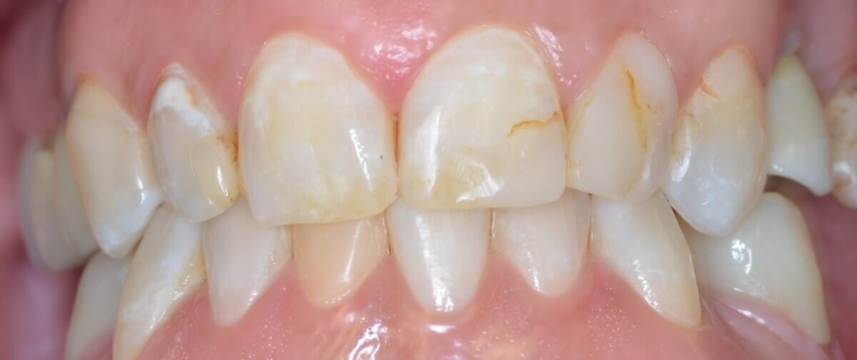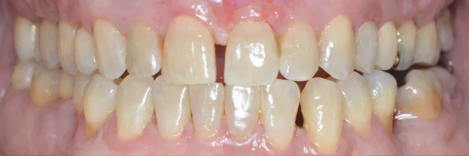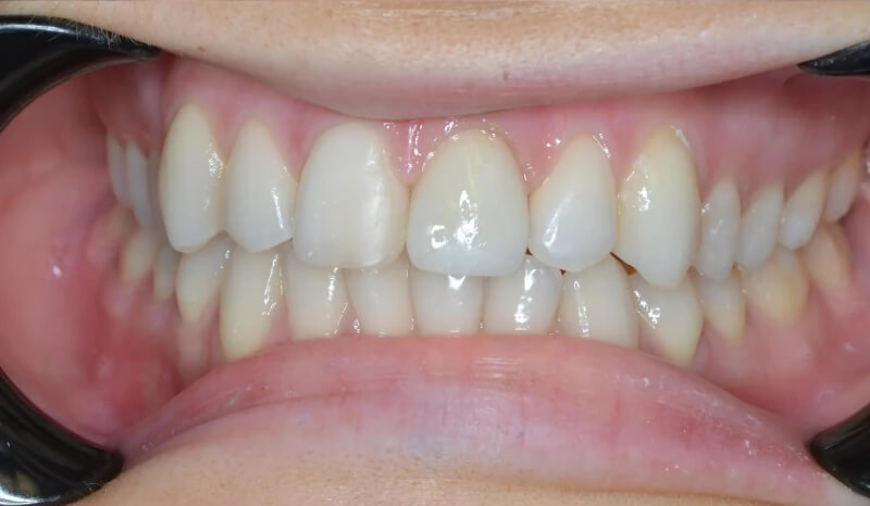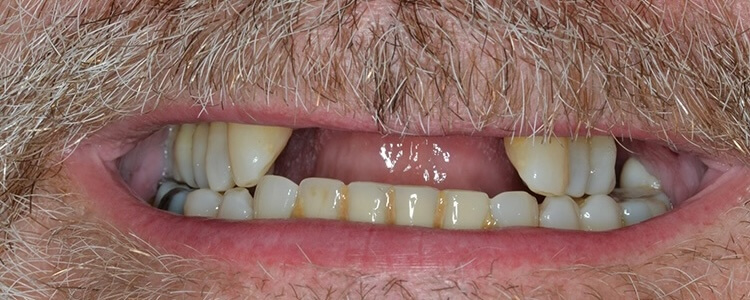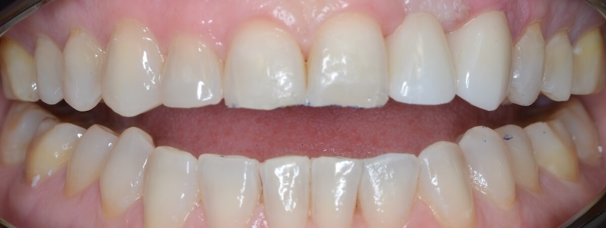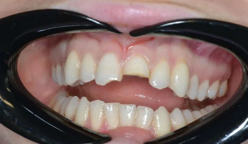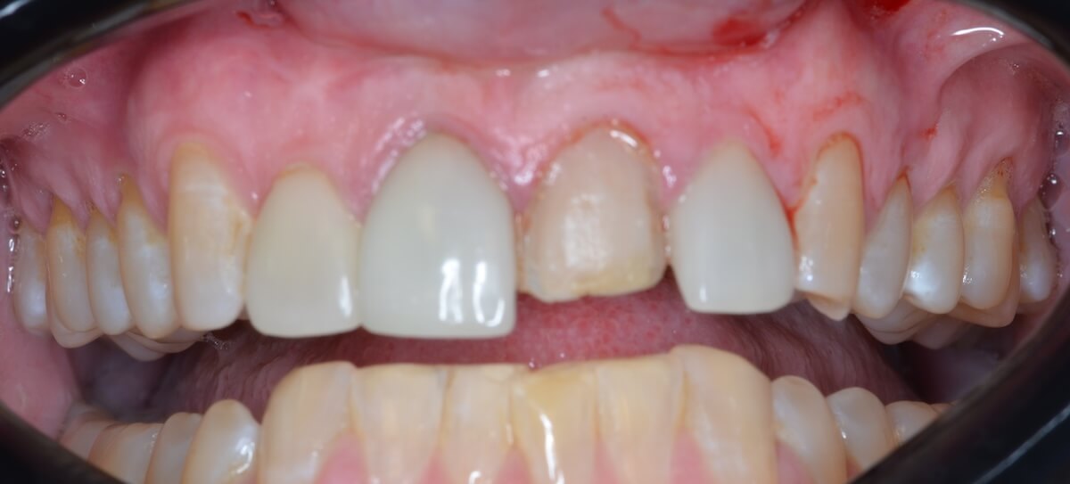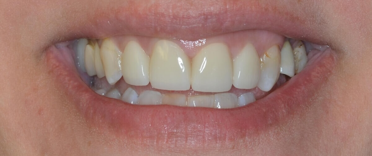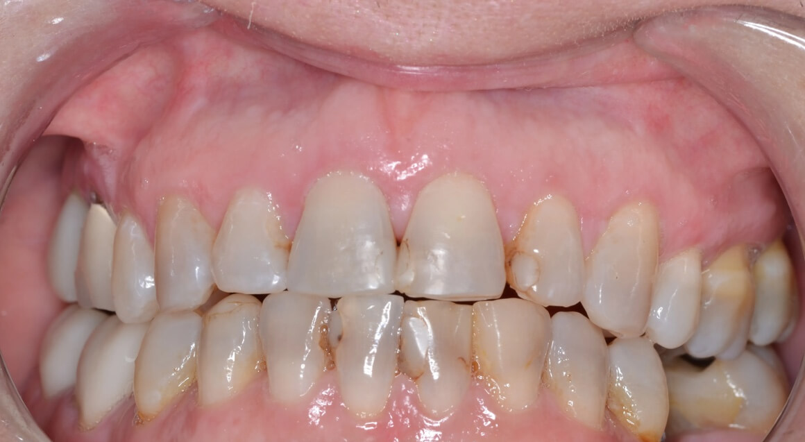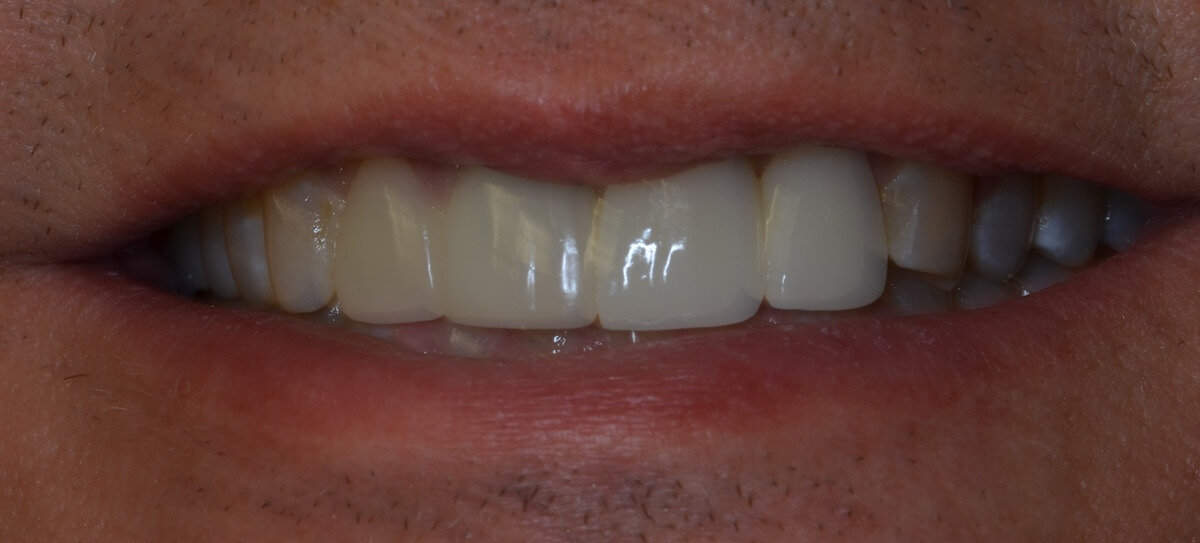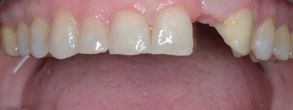 This patient had a calcified top-front tooth that was unable to be root canaled. We instead were able to extract the tooth and create a cantilever bridge that connected to one adjacent tooth. This bridge was able to restore her smile without the hassle of a removable appliance!